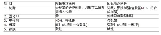 (2)陰極電泳涂料:陰極電泳涂料用的成膜聚合物是陽離子型樹脂,在樹脂骨架中含有多數(shù)的胺基.中和劑為有機酸,如甲酸、乙酸、乳酸等.陰極電泳涂料在水中離解成為陽離子的聚.合物,最常用的村脂有環(huán)氧樹脂和聚胺酯等.陽極電泳涂料和陰極電泳涂料組成的比較見下表.