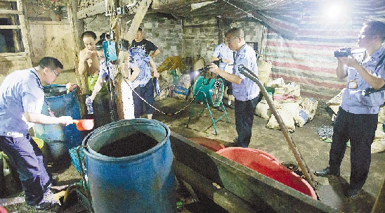 7月25日20時整,市環保局組織環境監察大隊、塘下分局、環境監測站,并聯合公安治安大隊,出動執法人員22人,執法車輛5輛,分兩組對塘下鮑田、海安、場橋一帶的非法小電鍍進行夜間突擊執法檢查,從嚴打擊非法排放重金屬環境犯罪。至次日凌晨零時,共檢查小電鍍加工點18家,其中7家正在生產。執法人員責令立即停止生產,并現場采集水樣9瓶。